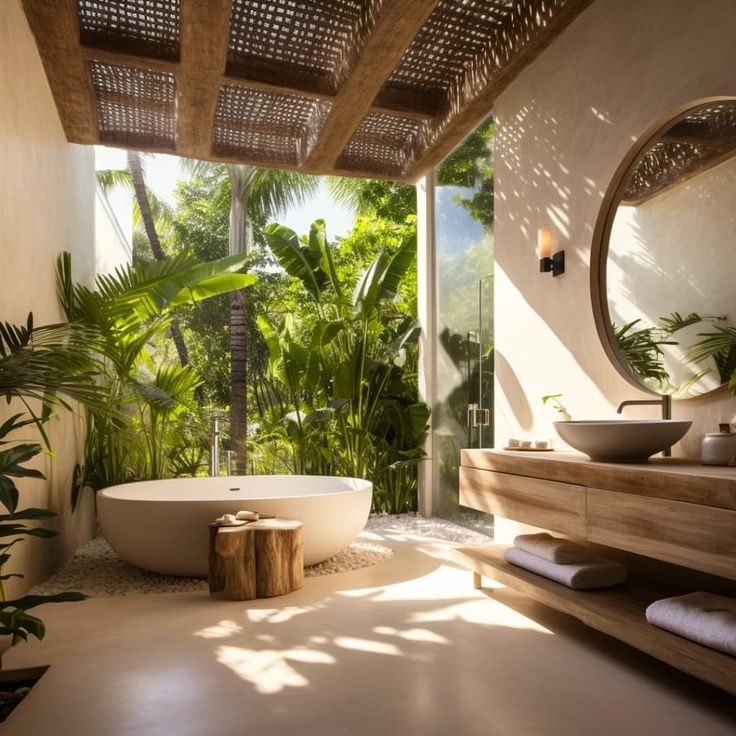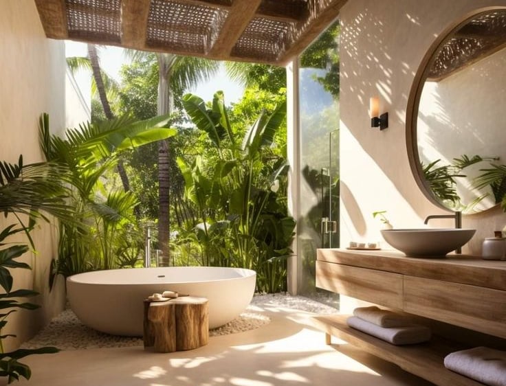 The comfortable atmosphere in the bathroom also affects your mood while in a villa with a Balinese concept. Make sure you add some decorations on the wall, such as additional round mirrors, towel racks and minimalist bathroom equipment to lamps with unique bamboo weaves. You can apply wood material in the bathroom, but with extra protection such as a sealant layer, so that the wood does not rot easily. Install an exhaust fan for good air circulation, so the bathroom is not stuffy.